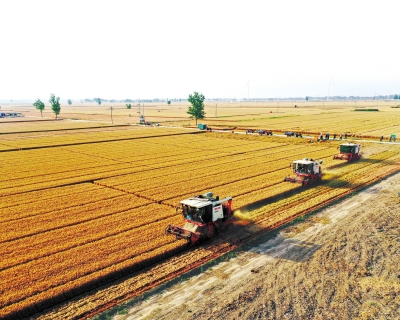 2022年夏,收割机在河南省安阳市滑县白马坡高标准农田示范区进行夏收作业新华社/图