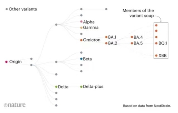 目前BQ.1和XBB是流行度最高的两个突变株家族。BQ.1来源于奥密克戎BA.5株,其子系BQ.1.1已经成为全球主要流行株。而作为两个奥密克戎BA.2后代突变株的重组体的XBB,有极强的免疫逃逸能力,在出现后短短两周内就在新加坡成为主要流行株,印度也基本被XBB所占据。二者在欧美广泛流行,上升趋势显著。