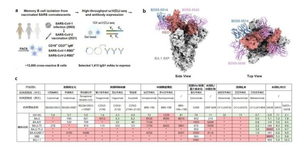 2022年8月,曹云龙所在研究团队宣布,在接种过三针新冠疫苗的非典(SARS)康复者中筛选出广谱中和抗体组合SA55/SA58,转让给北京科兴中维生物技术有限公司开展临床。据曹云龙介绍,SA55是目前国际上唯一对包括BQ.1和XBB在内所有当前流行株都有效的临床阶段抗体药物,SA58对于BF.7也有效。